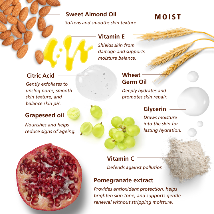 Ingredients: Pomegranate extract, Grape seed oil, Vitamin E, Vitamin C, Wheat germ oil, Sweet Almond, Citric acid. Does not contain Parabens, Sulphates, Synthetic Fragrance, Synthetic Colourants, and Lanolin derivatives, Mineral Oil or MIT’s.